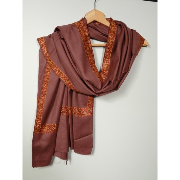 De superbes broderies très fines ornent les bordures de ce grand châle violine en laine très douce et chaude. Pièce unique.